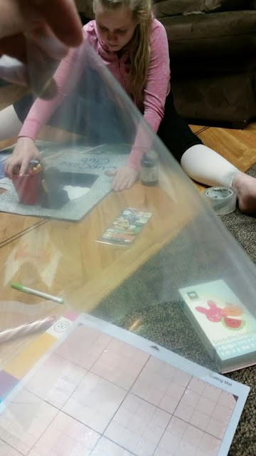 It was nearing 10:00 when she had Twiz pull out the CriCut for her to make the lettering a bit easier. She was using glittery paper, so Drama Queen suggested she use a brand new cutting mat. In typical Crafty fashion, she pull off the protective plastic and left it on the floor next to the cutter.