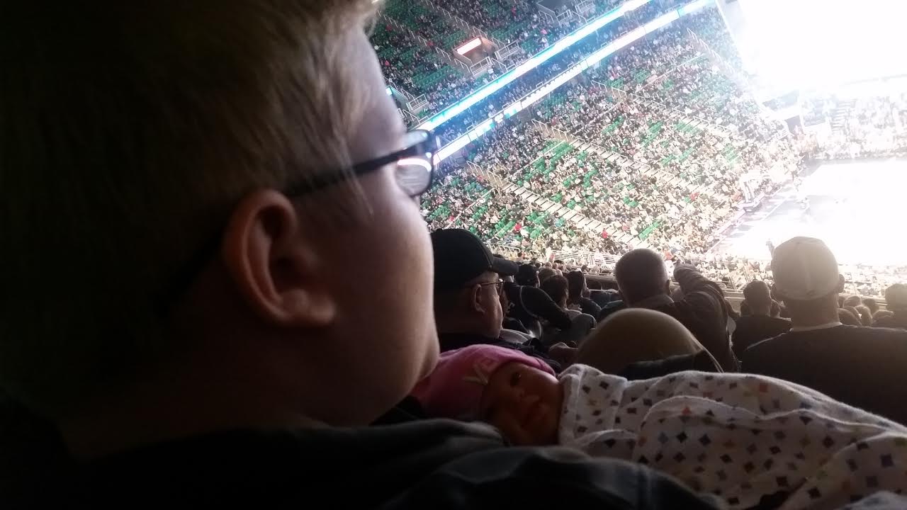 We checked with her every few minutes to make sure she was doing a good job and she was just so cute and careful. When her family was ready to leave after the 3rd quarter, Sport gave her a dollar for babysitting and she was totally ecstatic! Her dad stopped to thank me and told me that she loved babies and we just made her day.