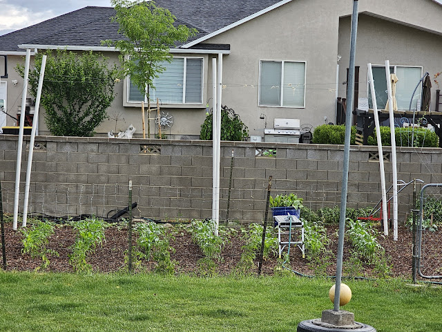 Mom has asked me to be her guest blogger while she's taking a break. Things have been going on lately, like setting up our bean structure in a very different sort of way in our garden. Every year, we've been putting the bean structure at the very back of our garden, but for different, Dad wanted to try it in front of our little rocky section in the garden. It meant having to post new poles and restringing the cable through the poles. Not only that, but we had to put in a couple of new stakes that help keep the cable tightened. Pretty soon, we'll need to start tying multiple pieces of twine on the bean structure.